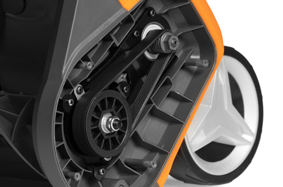 Ременный привод обеспечивает надежную передачу крутящего момента от двигателя к шнеку, одновременно защищая мотор от перегрузок и повреждений в случае застревания или блокировки шнекового механизма.